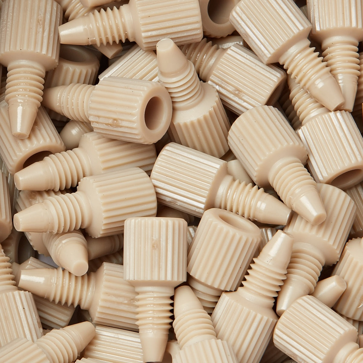 PEEK:stä (polyeetterieteriketoni) valmistetut HPLC (High-Performance Liquid Chromatography) -päätepistokkeet tarjoavat poikkeuksellisen suorituskyvyn ja luotettavuuden kromatografisissa järjestelmissä. Nämä erikoistuneet päätytulpat on suunniteltu tiivistämään HPLC-kolonnien päät tukevasti, mikä takaa vuotamattomat liitokset ja ylläpitää järjestelmän optimaalisen suorituskyvyn. PEEK on korkean suorituskyvyn omaava kestomuovi, jolla on erinomainen kemikaalien kestävyys, korkea lämpötilakestävyys ja alhainen uuttuvien aineiden määrä, joten se on ihanteellinen HPLC-sovelluksiin. PEEK-päätytulpat tarjoavat tiiviin ja kestävän tiivisteen, joka estää näytteen kontaminaation ja varmistaa tarkat ja toistettavat tulokset. PEEK:stä valmistetut HPLC-päätytulpat ovat ylivoimaisten mekaanisten ominaisuuksiensa ja yhteensopivuutensa ansiosta monenlaisten liuottimien kanssa ensisijainen valinta kromatografeille, jotka etsivät luotettavia ja tehokkaita kromatografiaerotuksia.