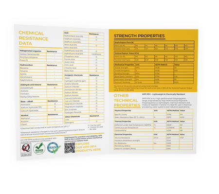 High-quality A4 datasheet that presents the key performance characteristics of PP in a clear, professional format. Printed on 250 gsm gloss paper for durability and a premium feel, it includes comprehensive technical data covering mechanical, thermal, electrical, and chemical properties.