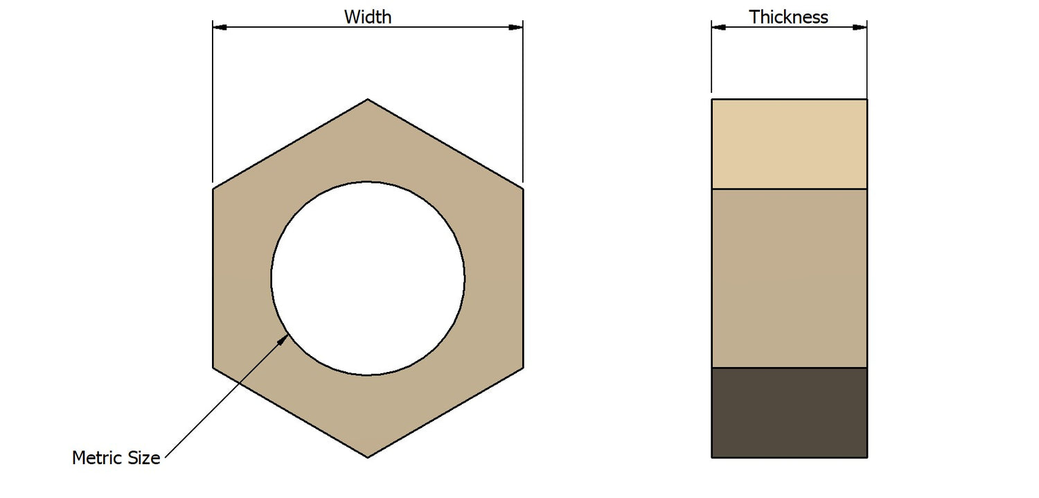 Kaikkien saatavilla olevien kokojen Imperial PEEK kuusiomutteri mitat on esitetty yllä olevan tuotepiirustuksen mukaisesti.