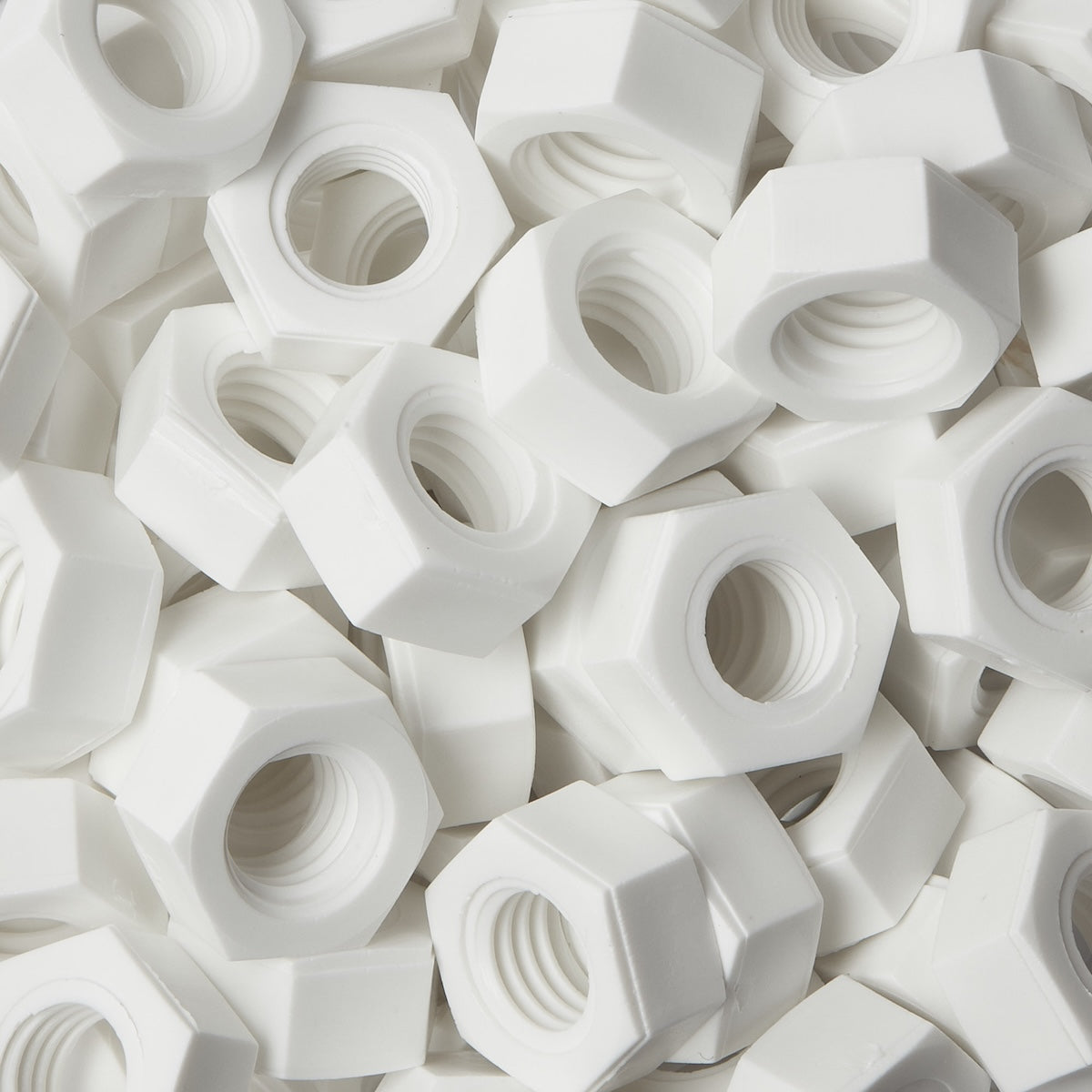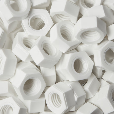 Polypropeenista (PP) valmistetut kuusikulmaiset mutterit ovat DIN 934 -standardin mukaisia, ja niitä voidaan käyttää yhdessä monien eri materiaaleista valmistettujen kiinnittimien kanssa sovelluksesta riippuen. Saatavana metrisiä standardikokoja (M4-M12).