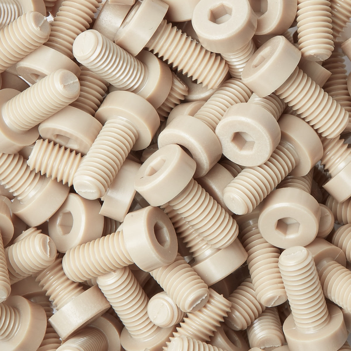 PPS-ruuvivalikoimamme on vahvistettu 40 % lasikuidulla, mikä mahdollistaa vetolujuudet, jotka ovat samanlaiset kuin PEEK GF30 (30 % lasikuituvahvisteinen) -valikoimassamme, mutta paljon suuremmalla kokovalikoimalla ja alhaisemmilla kustannuksilla.
