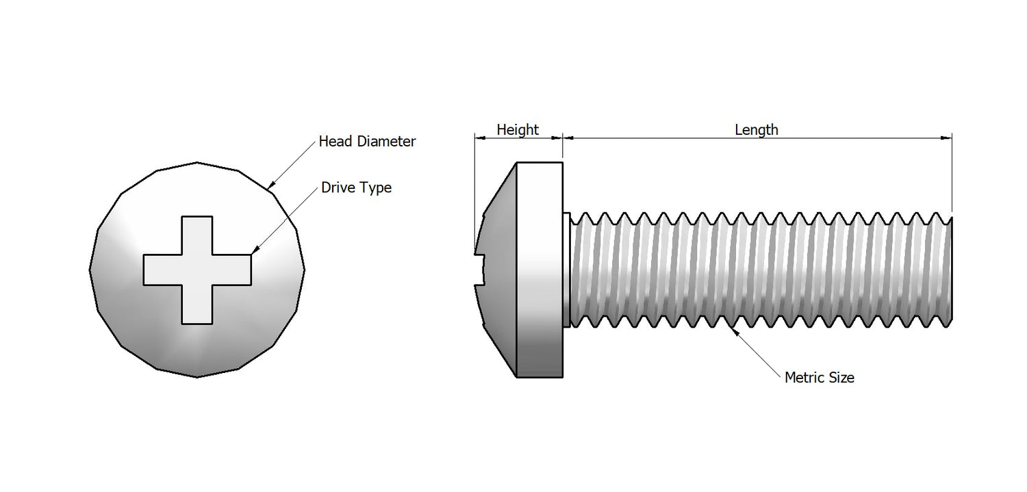 Kaikkien saatavilla olevien kokojen PTFE Teflon Pan Head Ruuvit - ristiin upotetut Phillips-ruuvit mitat on esitetty yllä olevan tuotepiirustuksen mukaisesti.